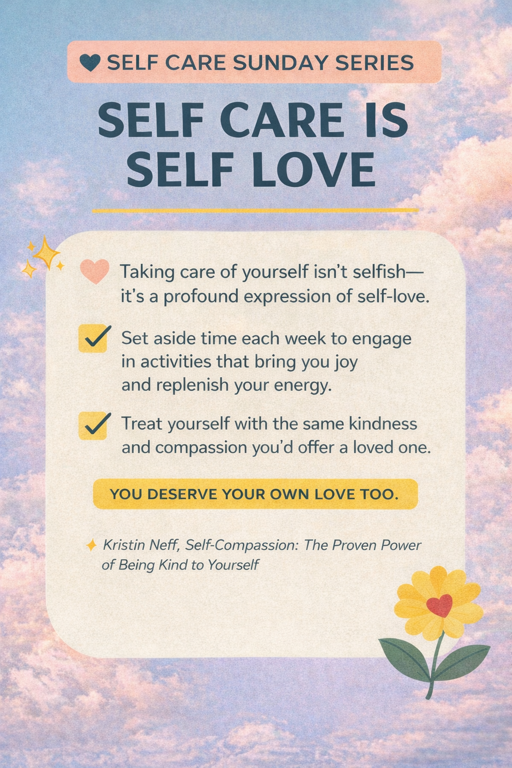 Self-care isn’t selfish—it’s one of the highest forms of self-love. When you prioritize your well-being, you’re affirming that your needs matter. From setting boundaries to making space for rest, self-care helps replenish your energy, focus, and confidence. It also supports emotional regulation and resilience, making it easier to show up fully in all areas of your life (Neff, 2011).